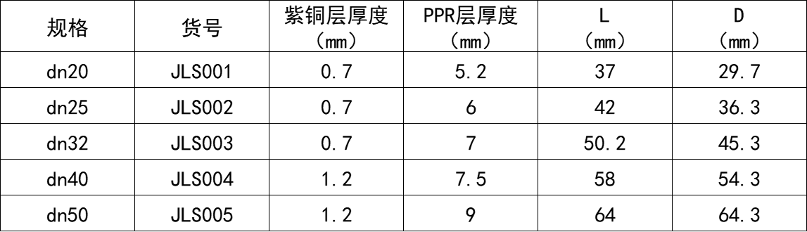 • 颜色: 海湖蓝• 压力等级: S2.0• 原材料:T2紫铜含铜量不低于99.9%,北欧化工PPR原料颗粒、进口热熔胶• 执行标准:GB/T1176-2013、GB/T1527-2017、GB/T18742-2017• 卫生性能许可标准:《生活饮用水卫生监督管理办法》• 卫生性能优点:杀菌、抑菌、环保、内管壁永不结垢,杜绝二次污染• 物理性能优点:工作压力80kg检测压力180kg、且柔韧性佳有效减少水锤现象爆管发生几率、耐温100摄氏度、热膨胀系数低热水管不弯曲、导热系数021w/mk保温性能优、通径无堵塞水流量更大、百分之100遮光阻止氧化防止紫铜腐蚀、百分之100阻氧阻隔细菌和微生物生长条件。• 安装方式:热熔承插,产品有锥度导向设计专利会主动校准。• 适用场景: 直饮水、全屋净水、活水、反渗透水、软水、实验室用水、医院手术室用水等等对水质有特殊要求的水管输送场景。
